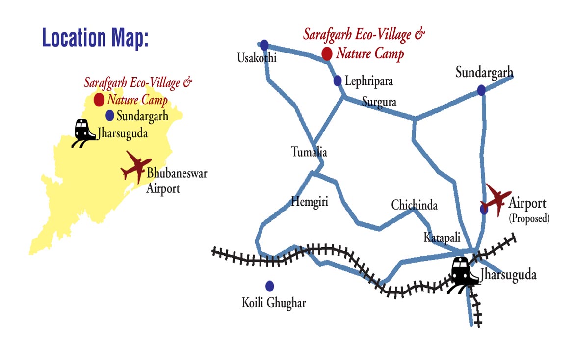 -- At present nearest Air Port is Bhubaneswar which is 440 kms from the Nature Camp site and Jharsuguda Air Port will be made operational shortly which is 25 kms. from Sundargarh.